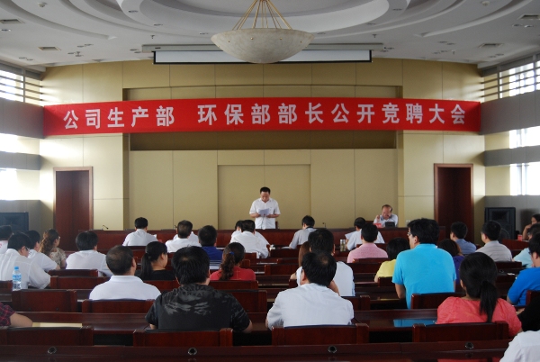 本网讯 8月12日下午,在总部十七楼会议室公司对生产部长和环保部长两职务进行公开竞聘大会,全公司各单位和机关共十三名具有资格的应聘者进行最后的竞聘演讲和答辩。