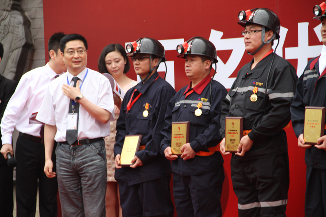 本网讯 5月25日至28日,由全国煤炭行业共青团工作指导和推进委员会主办,中国煤炭工业传媒联盟、《中国煤炭工业》杂志社承办的全国煤炭工业第二届“百名优秀青年矿工”评选发布系列活动在京举行。中宣部、全国总工会、团中央、国家新闻出版广电总局等嘉宾出席发布仪式。集团副董事长、党委副书记曹乐正出席并同其他煤炭企业领导为优秀矿工颁发了奖牌。