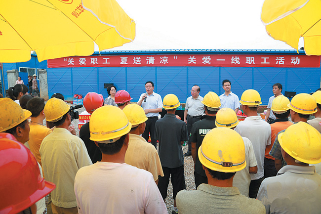 本网讯 7月26日上午,市人大副主任、市总工会主席任建宏带领慰问组在集团党委副书记、工会主席殷明陪同下深入兰花物流公司施工现场慰问,详细了解了一线工人的生活和工作情况,并送上了防暑降温物资,为工人们作出的贡献表示感谢。一句句关心的话语、一份份慰问的物品,让工人们感受到工会领导和工会组织对他们的亲切关怀。(刘洁)