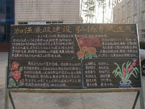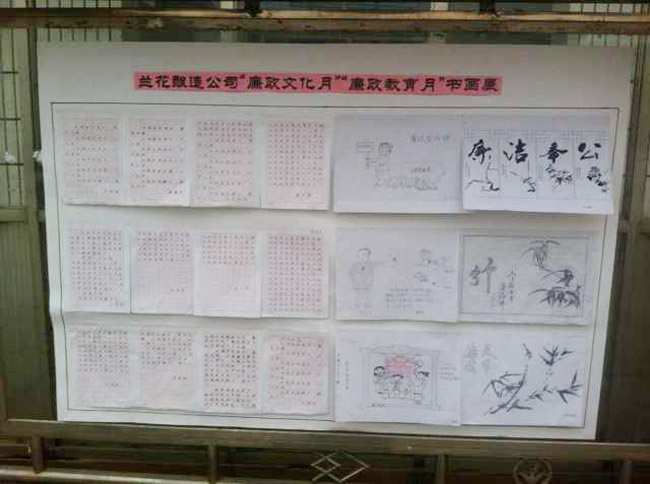 本网讯 自公司党委下发《关于开展2014年“廉政教育月”和“廉政文化月”活动实施方案》以来,各单位以“六个一”为内容,并结合自身实际,一系列丰富多彩的廉政文化教育活动在公司上下展开。同时还通过发送廉政短信、制作廉政板报等形式,把廉政文化建设的触角延伸到企业工作与生活的各个方面,从而增强了广大干部职工廉洁从业意识和拒腐防变能力,营造起浓厚的廉政文化氛围。 (兰花报综合报道)