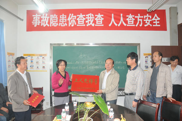 本网讯 在今年的省“五一”表彰大会上,莒山矿综掘队荣获省“工人先锋号”荣誉称号。9月21日,市总工会常务副主席任建芳、副主席殷杰云在集团公司党委副书记、工会主席殷明的陪同下专程到莒山矿,代表省总工会为该矿综掘队授牌。