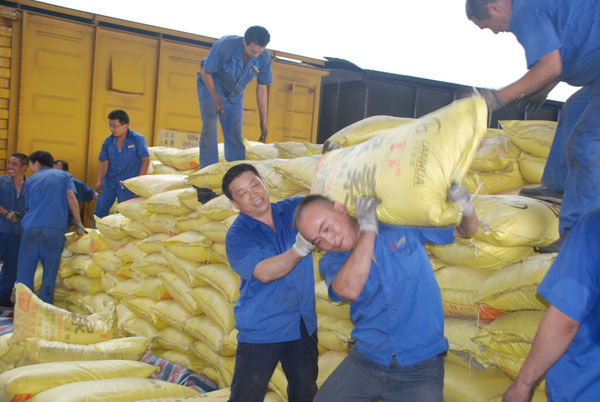 7月4日中午,该厂又召开紧急会议,从12个生产车间抽调200多人组成8个装车突击队,到晋城北站东货运站解围。每个突击队承包一节车皮,需要和原装卸队共同完成800吨的装车任务。下午2时,厂长李虎、工会主席张向阳、生产厂长吕纪烈、经营厂长王志强冒雨火速赶到现场,与销售站和基层车间的干部员工并肩作战,一起装运尿素。前来装尿素的员工用手抬,用肩扛,挥汗如雨,一声不哼的当“搬运工”!干累了,喘口气,喝口水,接着又干。这些“搬运工”中,有厂部领导、中层干部,有年近花甲的老人、有刚参加工作的大学生,有上白班的维修工、有倒松班从家赶来的操作工。在这里没有高低之分,没有大小之别,有的就是尽快装车,把产品运出去。虽然大家都是没有出过苦力气的“文人”, 但是党员干部任劳任怨、乐于奉献的精神无不鼓舞着在场的每一个人。经过3个小时的艰苦劳作,8个突击队圆满完成了装车任务。看着码放齐整的尿素车皮封厢的一刹那,大家终于长长的松了一口气。此时的劳累已被减轻库存压力、降低周转资金的幸福所掩盖,虽累但累有所值。