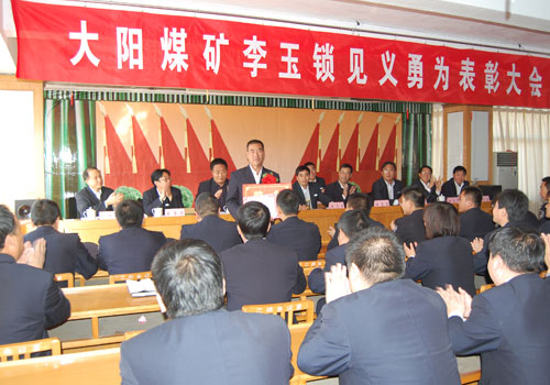 为了表彰先进,弘扬正气,严厉打击违法犯罪现象,大阳煤矿分公司近日隆重召开见义勇为表彰大会,对分公司机电三队职工李玉锁同志在一起持刀打架斗殴事件中,临危不惧,智夺歹徒凶器,挽救职工性命的见义勇为行为进行表扬,并奖励其2000元。